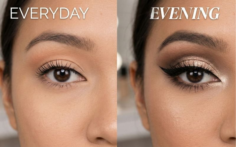 For a night out, layer in a deeper crease shadow, define the outer V, apply a lifted wing, add shimmer to the center lid, and finish with false lashes. The same structural techniques apply , you’re just amplifying the contrast and drama.