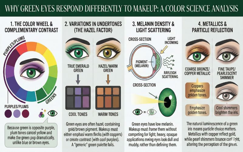 Before jumping into looks, it helps to understand why green eyes behave the way they do under different shades. Green sits between warm yellow and cool blue on the color wheel, which means most green eyes carry some golden, olive, or gray undertone depending on the individual. That complexity is actually your advantage , it means a wide range of shades, from warm bronzes to cool purples, can interact with your eye color in flattering ways.